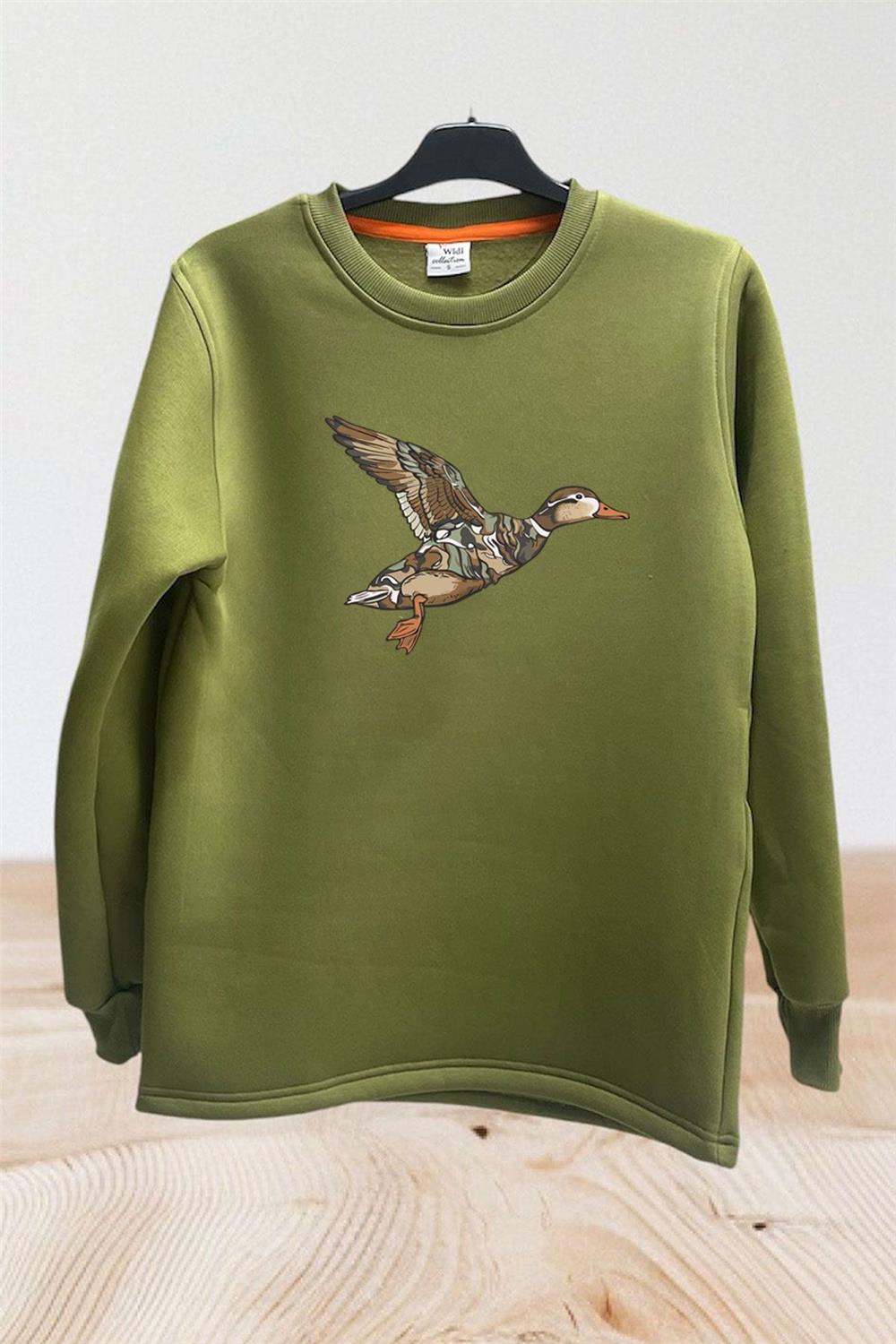 Avcılık Hunter Kamuflaj Desen Ördek Baskılı Regular Fit %100 Pamuk Bisiklet Yaka Sweatshirt - Haki (WİDİ643)