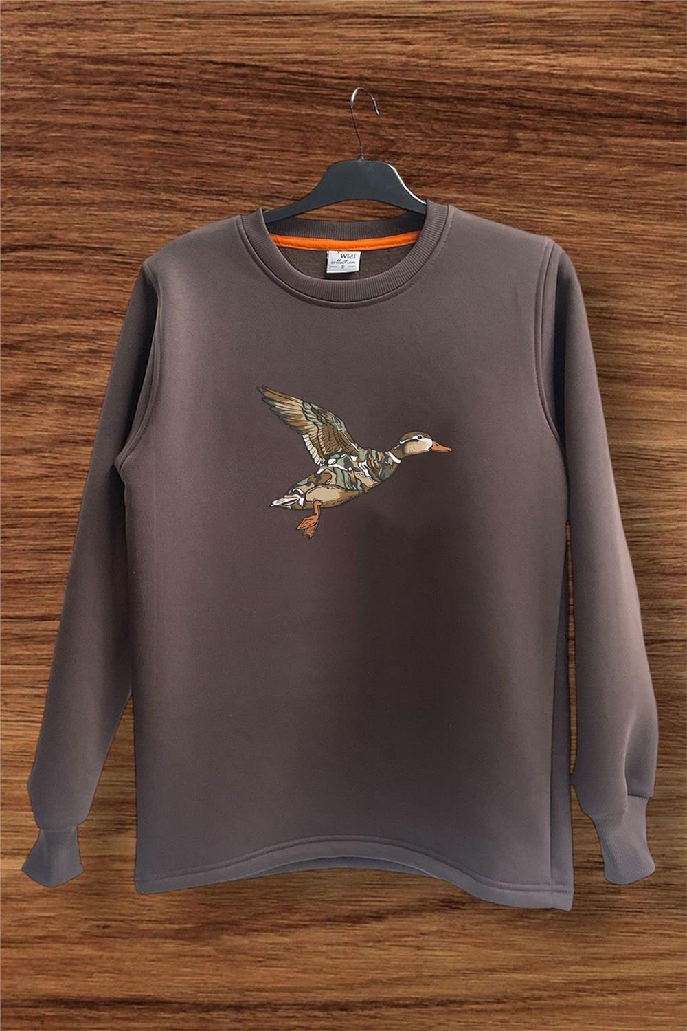 Avcılık Hunter Kamuflaj Desen Ördek Baskılı Regular Fit %100 Pamuk Bisiklet Yaka Sweatshirt - Kahverengi (WİDİ643)