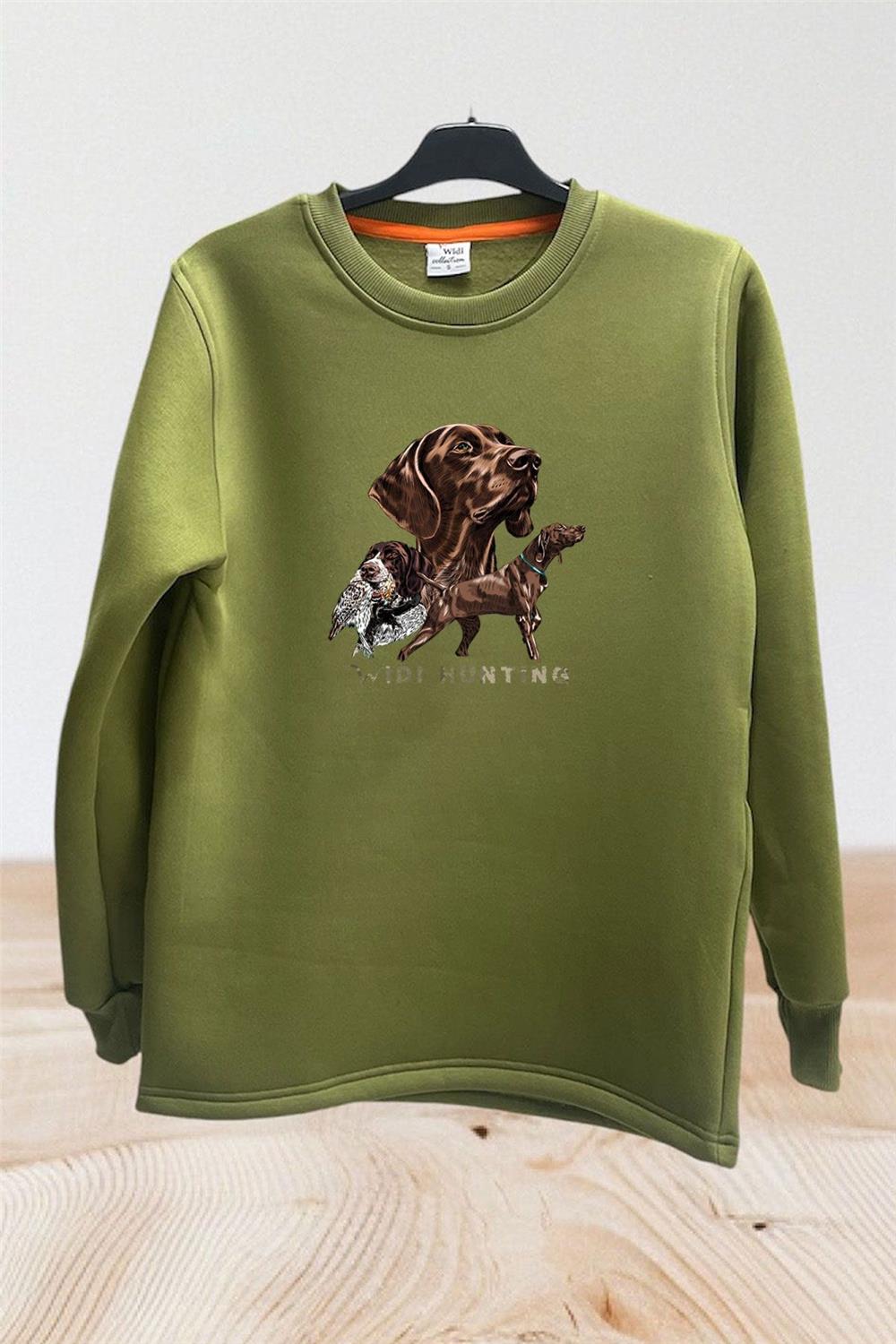 Avcılık Hunter Kurzhaar Av Köpeği Ve Çulluk Baskılı Regular Fit %100 Pamuk Bisiklet Yaka Sweatshirt - Haki (WİDİ664)