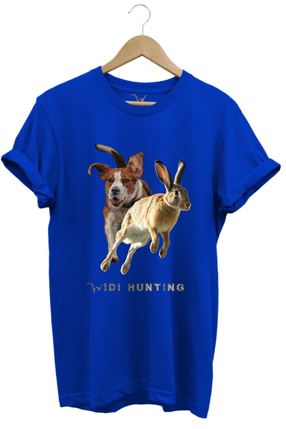 Avcılık Hunting Tavşan Avı Ve Av Köpeği Tasarım Baskılı %100 Pamuk Regular Fit Unisex T-Shirt - Mavi (WİDİ659)