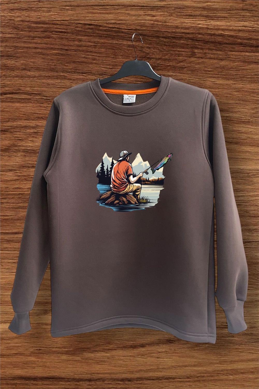 Fishing Balıkçılık Baskılı Olta Ile Alabalık Avı Regular Fit %100 Pamuk Sweatshirt - Kahverengi (WİDİ699)