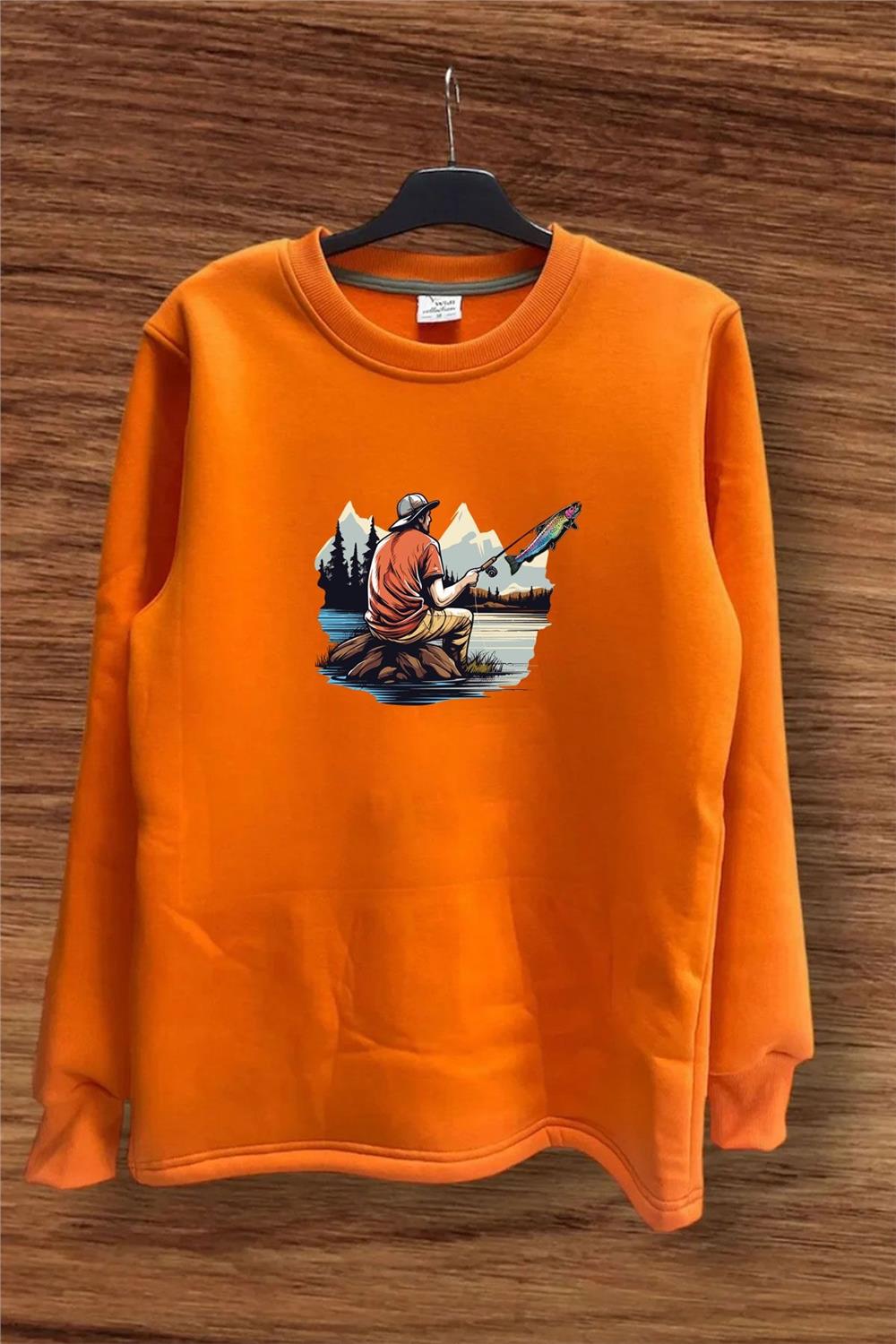 Fishing Balıkçılık Baskılı Olta Ile Alabalık Avı Regular Fit %100 Pamuk Sweatshirt - Turuncu (WİDİ699)