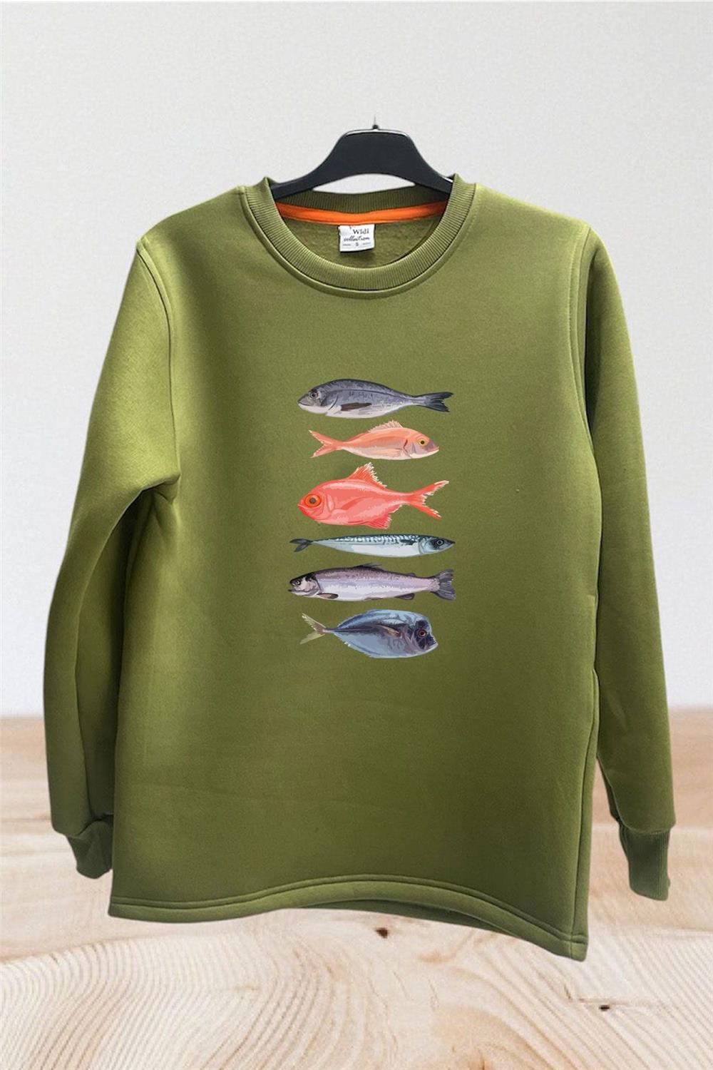 Fishing Balıkçılık Baskılı Renkli Çeşitli Balık Tasarım Baskılı Regular Fit %100 Pamuk Sweatshirt - Haki