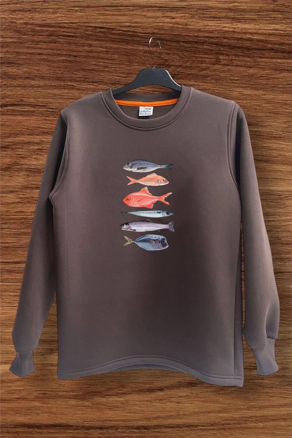Fishing Balıkçılık Baskılı Renkli Çeşitli Balık Tasarım Baskılı Regular Fit %100 Pamuk Sweatshirt - Kahverengi (WİDİ698)
