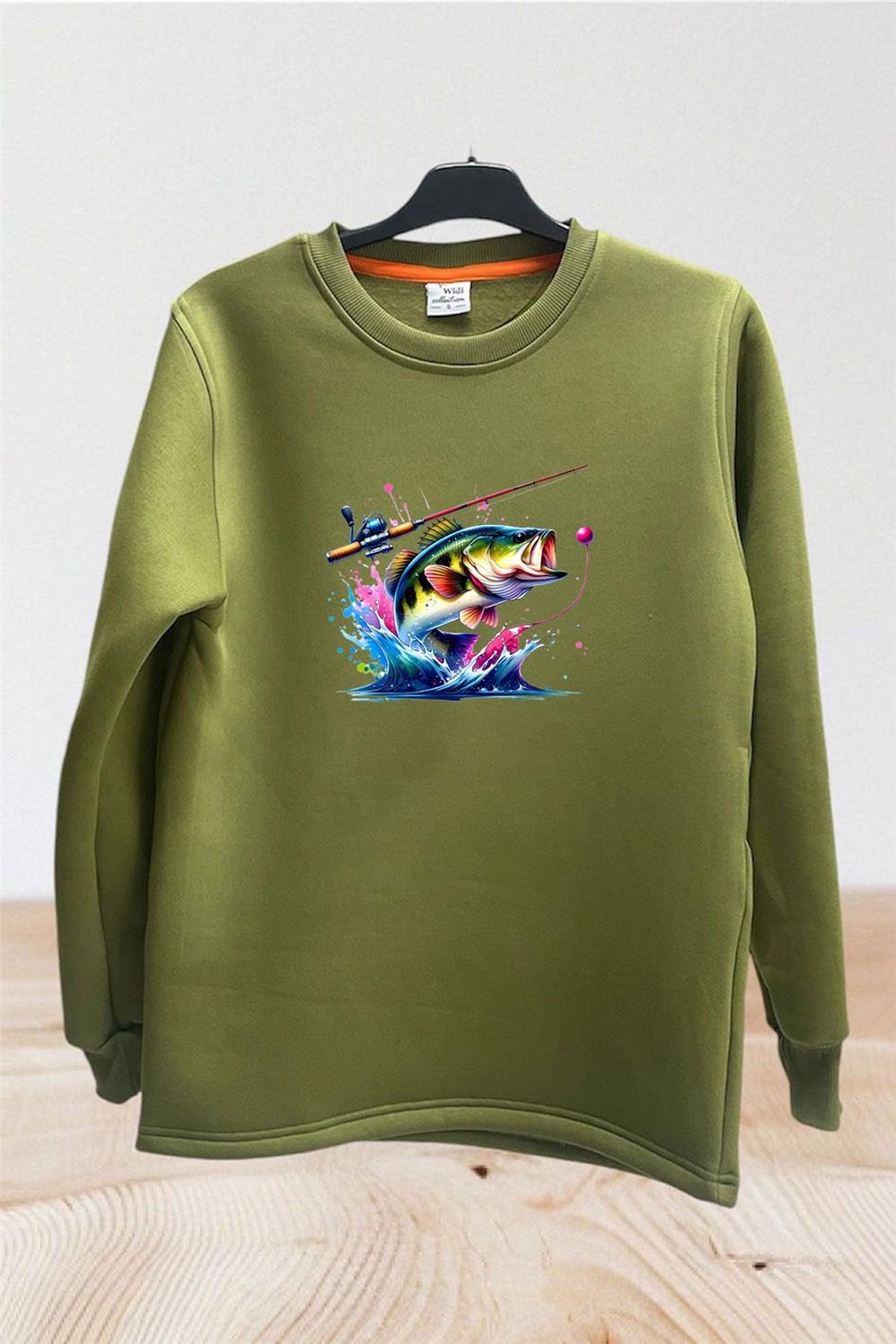Fishing Balıkçılık Renkli Levrek Balığı Baskılı Avcılık Regular Fit %100 Pamuk Sweatshirt - Haki