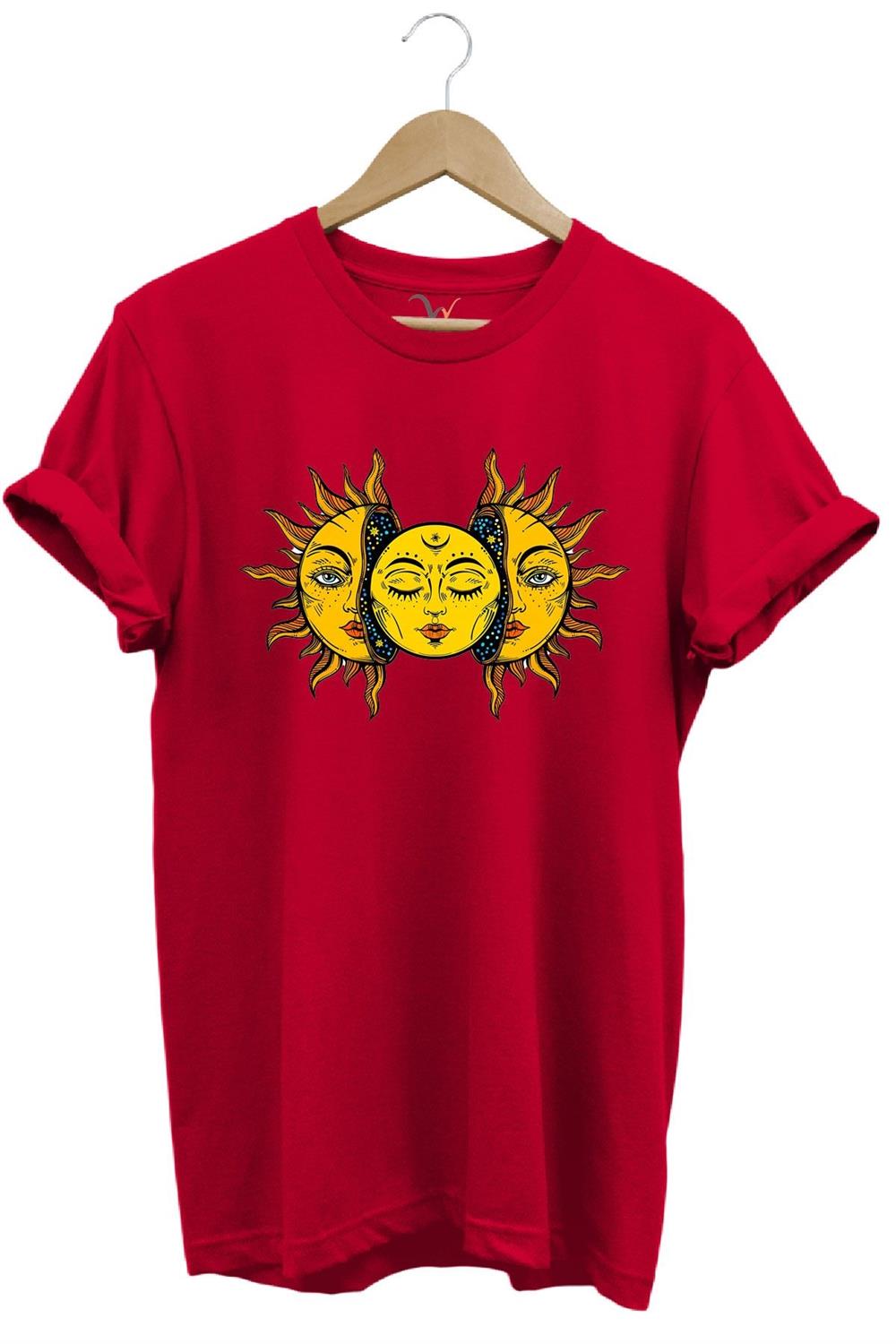 Güneş Baskılı %100 Pamuk Regular Fit Unisex T-Shirt - Kırmızı (WİDİ648)