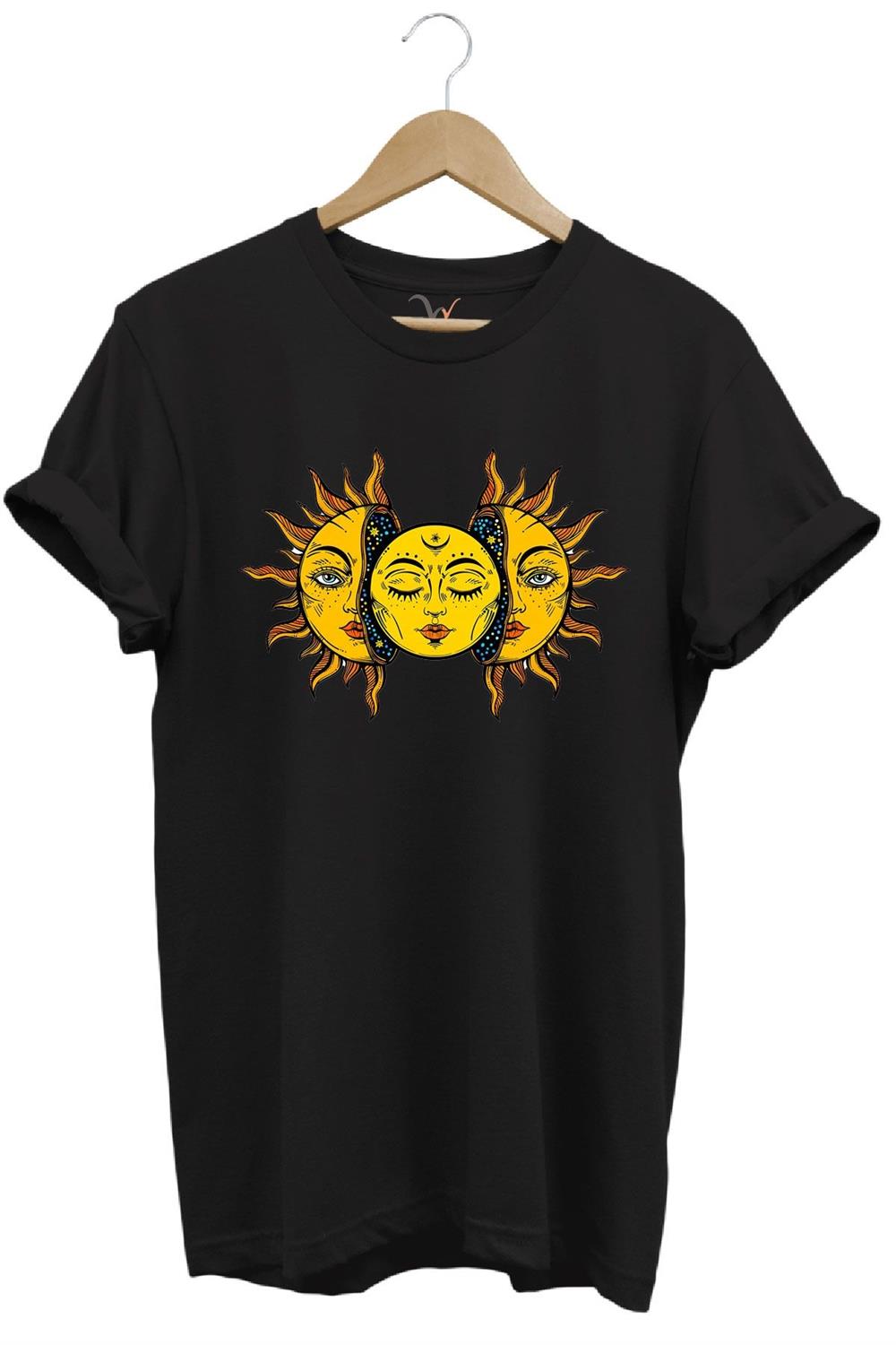 Güneş Baskılı %100 Pamuk Regular Fit Unisex T-Shirt - Siyah (WİDİ648)