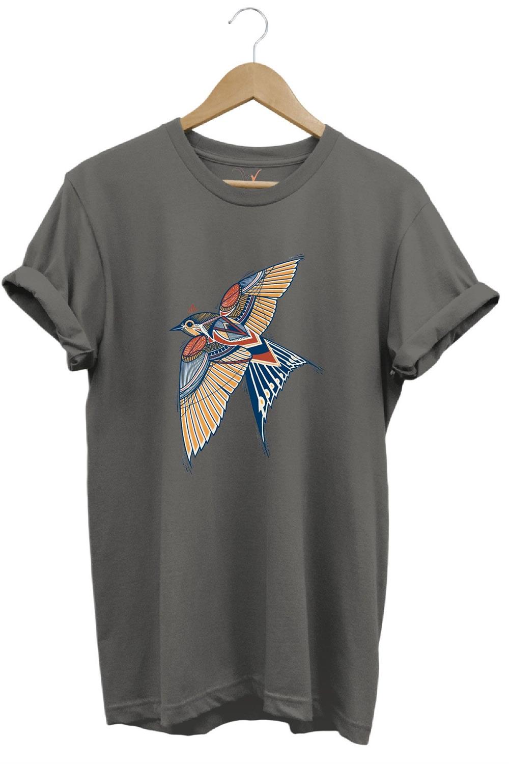 Kırlangıç Kuşu Dekoratif Baskılı %100 Pamuk Regular Fit Unisex T-Shirt - Antrasit (WİDİ649)