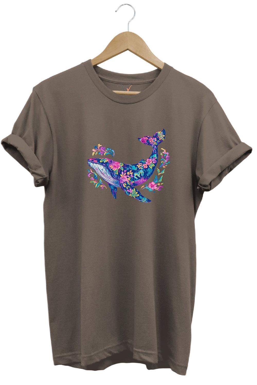 Renkli Balık Balina Desenli Baskılı %100 Pamuk Regular Fit Unisex T-Shirt - Kahverengi (WİDİ647)
