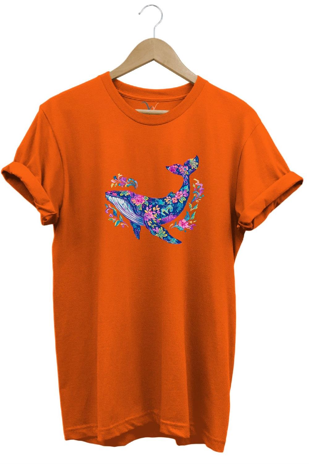 Renkli Balık Balina Desenli Baskılı %100 Pamuk Regular Fit Unisex T-Shirt - Turuncu (WİDİ647)