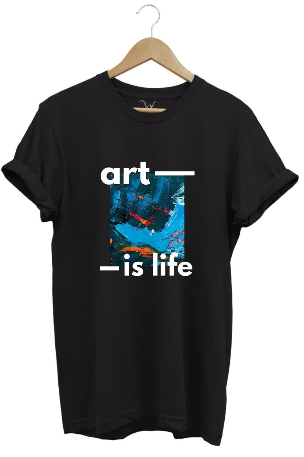 Sanatsal Renkli Tasarım Baskılı Art İs Life Yazılı %100 Pamuk Regular Fit Unisex T-Shirt - Siyah (WİDİ650)