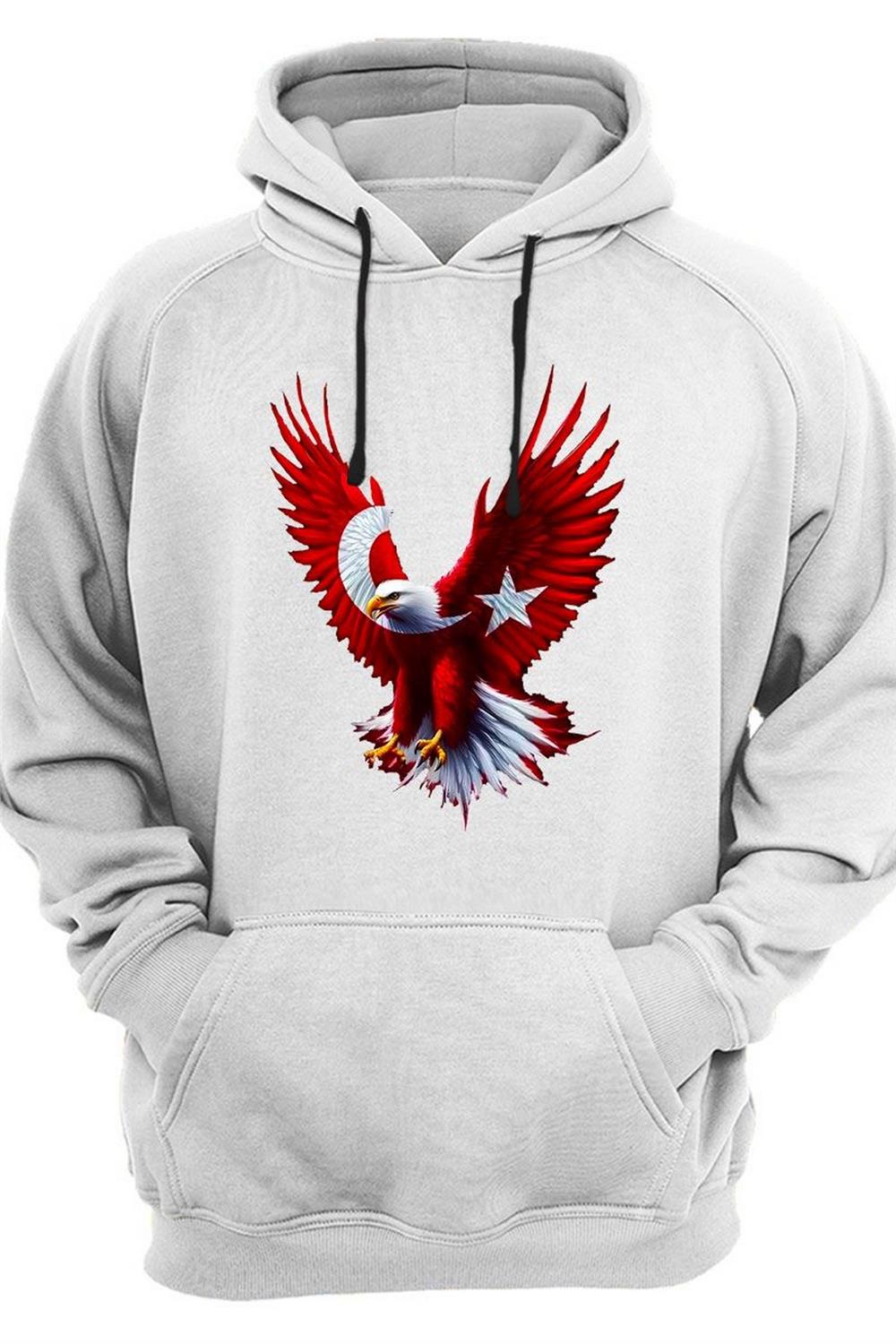 Türkiye Ay Yıldız Bayrak Kartal Baskılı 3 Iplik Kalın Şardonlu Kanguru Cepli Sweatshirt - Beyaz (WİDİ687)