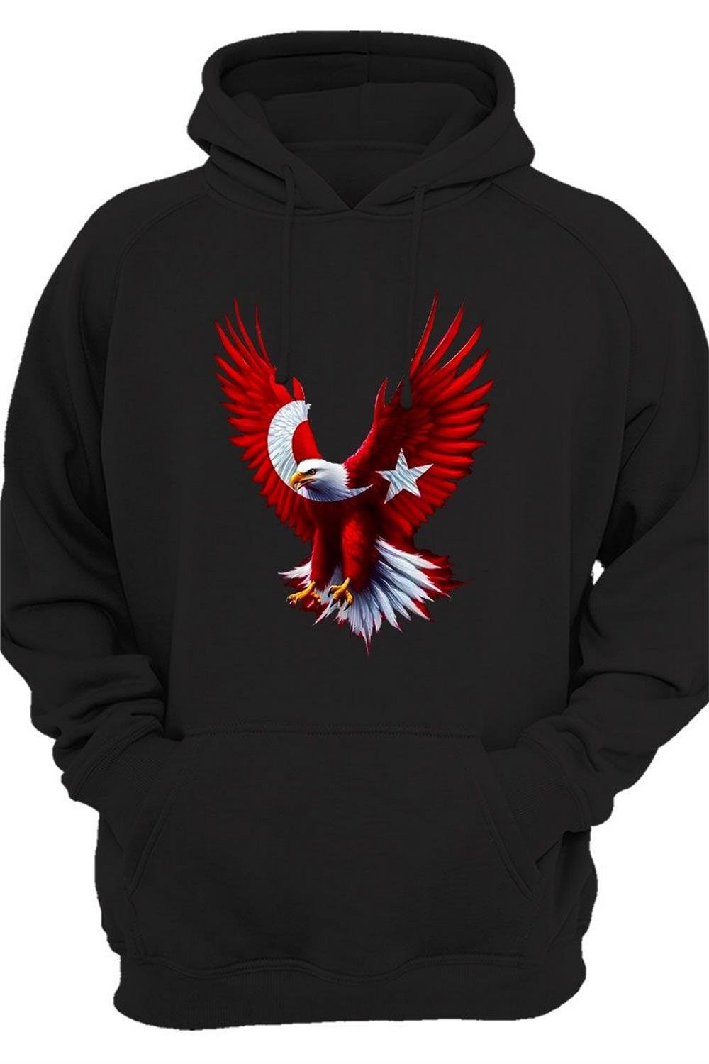Türkiye Ay Yıldız Bayrak Kartal Baskılı 3 Iplik Kalın Şardonlu Kanguru Cepli Sweatshirt - Siyah (WİDİ687)